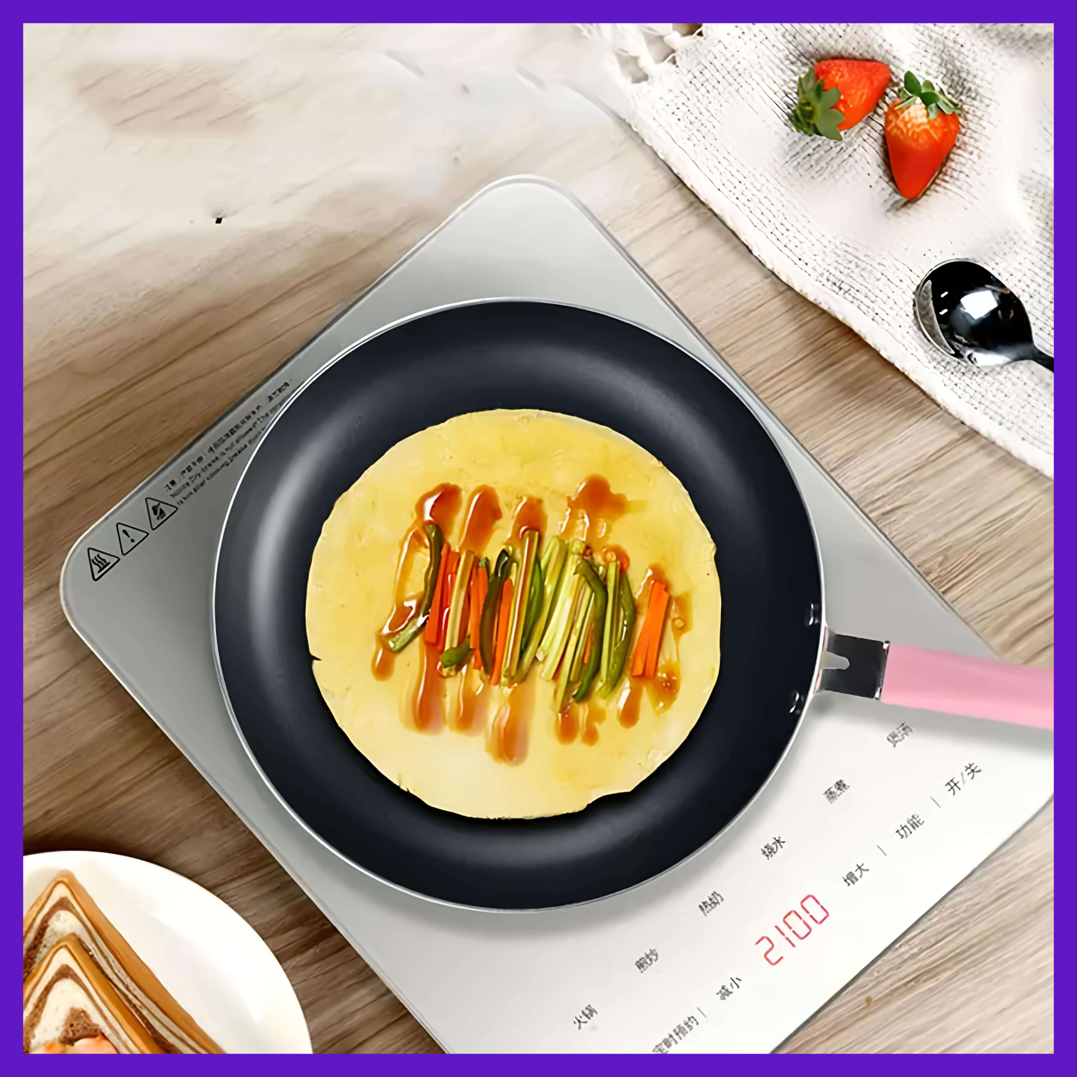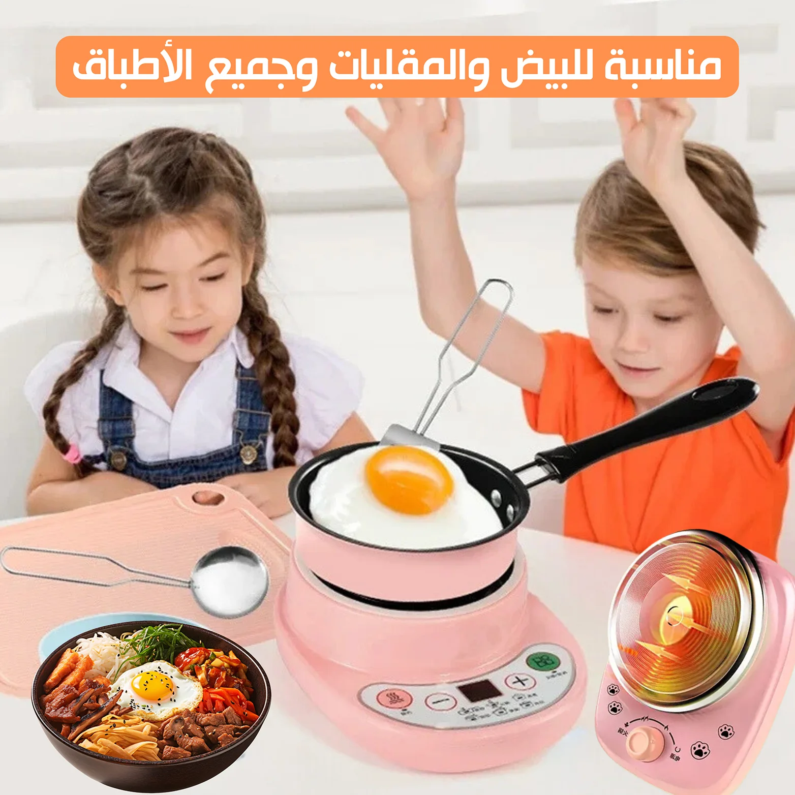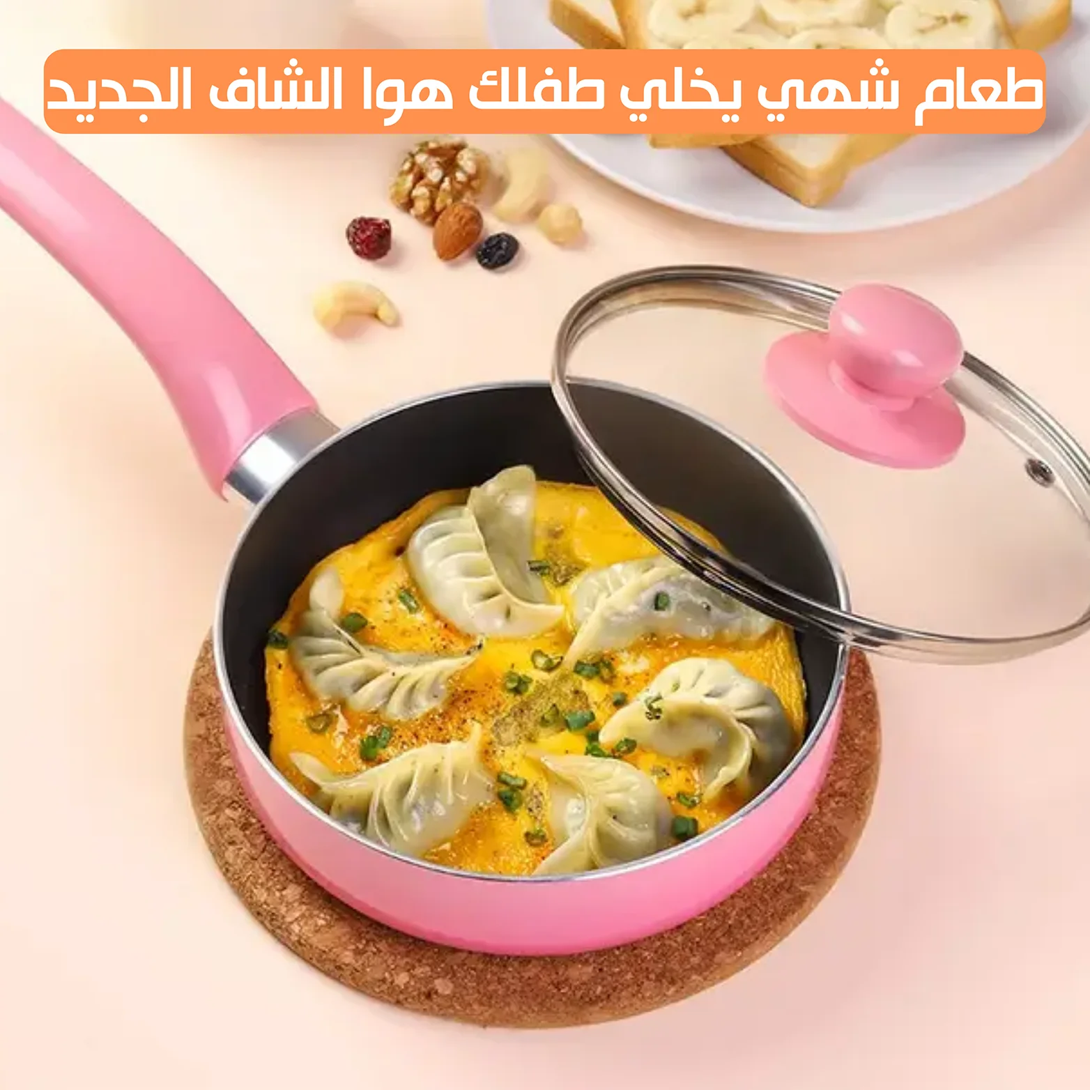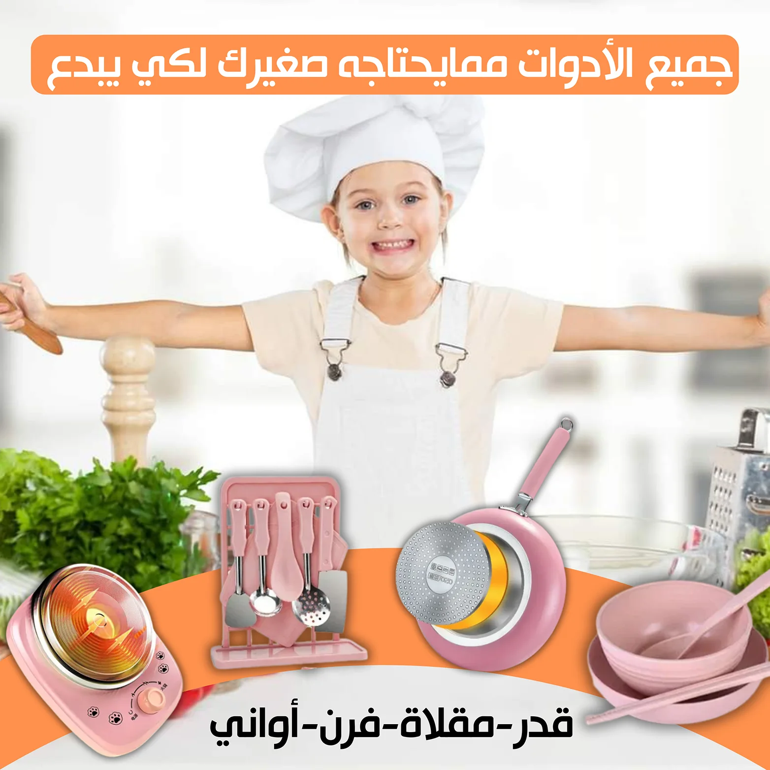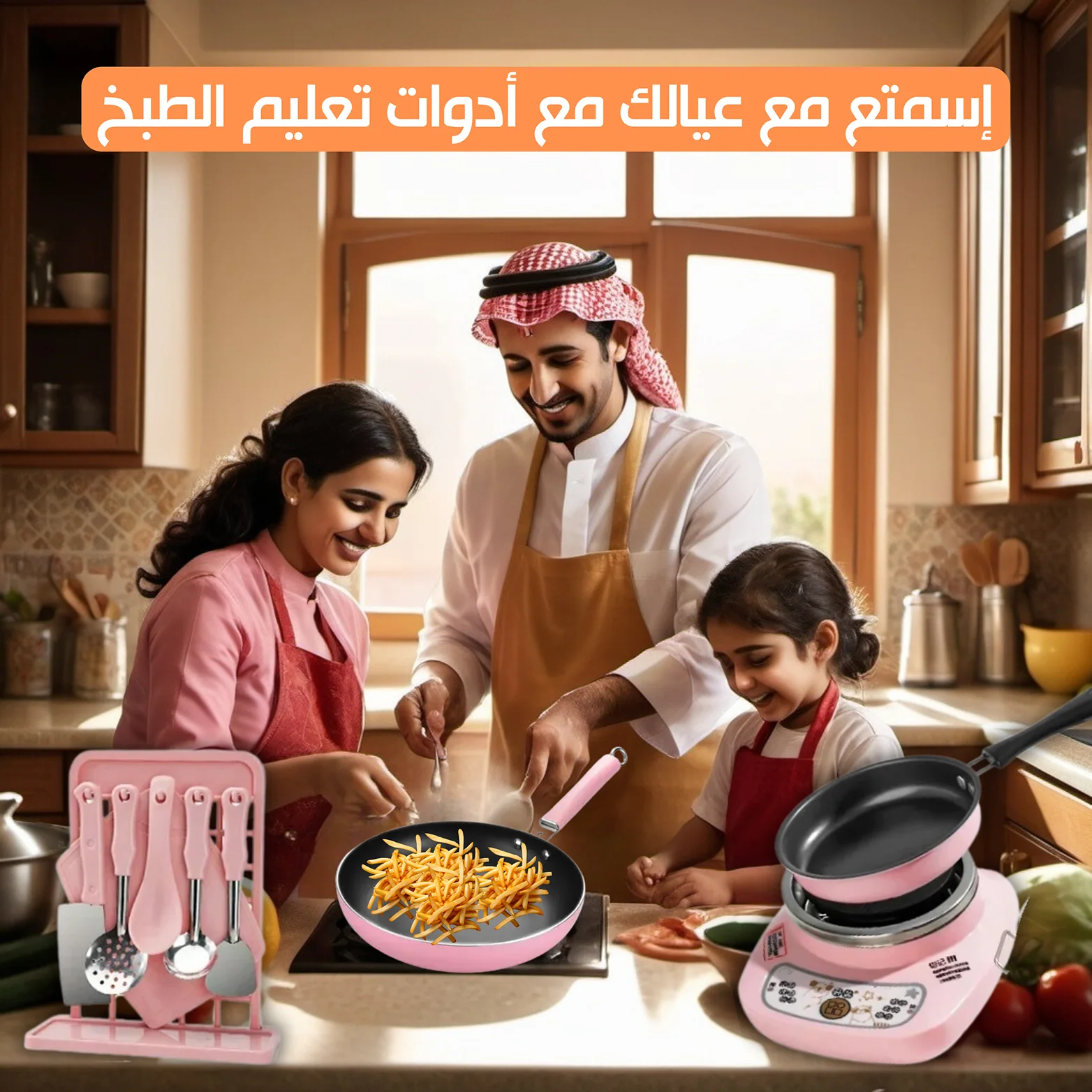 مقلاة مغلفة بطلاء صحي + ملعقة كبيرة للخلط والتحريك + فرن كهربائي + ملعقة مشقوقة + صحون مشكلة
